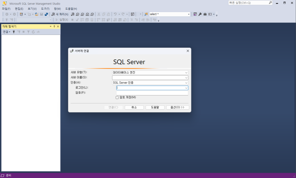 일반적으로 DB 접속에 필요한 서버이름, 로그인계정, 암호를 입력하게 되어있습니다.