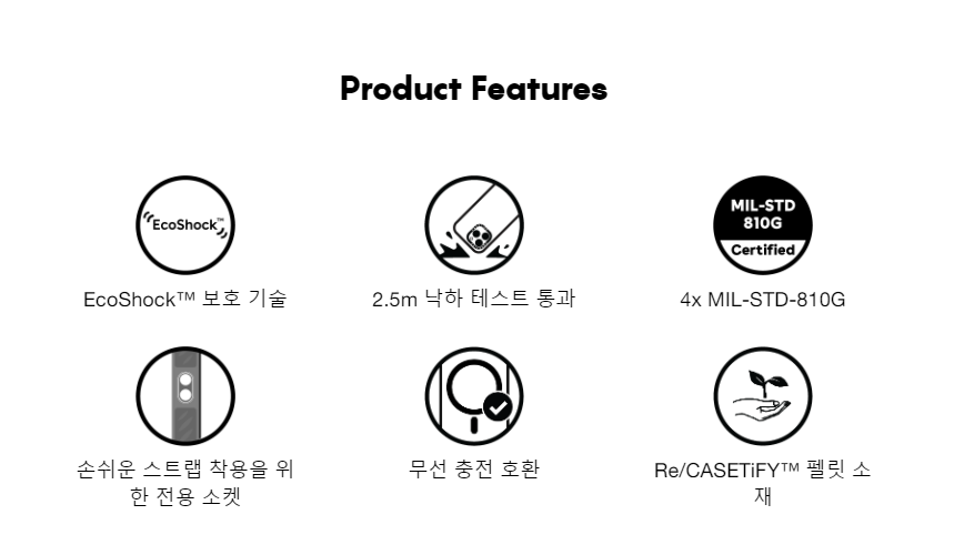 케이스티파이에서 강력한 보호력을 자랑하는 케이스. 독자적 보호 기술 EcoShock™으로 마감된 코너 설계로 최대 6.5M의 낙하 실험을 통과했으며 MIL-STD-810G 밀리터리 등급 기준 6배에 달하는 보호력을 보여준다고 합니다. 전면 디스플레이를 보호하기 위해서 베젤이 두껍게 튀어나오도록 설계되어 있어서 앞으로 떨어져도 액정이 바닥에 직접적으로 닿지 않아 파손 위험을 줄여줍니다. 맥세이프 기능이 포함되어 있습니다. 다만, 보호력에 치중된 제품이니만큼 무게가 상당히 무겁고 디자인이 다른 케이스에 비해 비교적 투박하다는 단점이 있습니다.