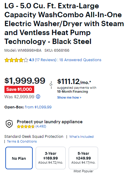 2 시간 안에 세탁과 건조가 끝나고, 연간 소비전력이 기존 20년형 건조기가 270 kWh 인데 비해 LG 워시콤보는 99 kWh입니다. 미국 출시 가격은 $2,999인데 현재 33% 할인으로 $2,000 미만으로 판매되고 있습니다. 한화로 약 270만 원 정도입니다.