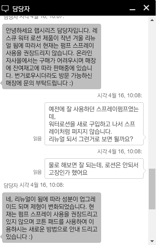 지난해 구입해서 사용하다 랩시리즈 데일리 레스큐 워터로션을 새로 구입하고 사용하는데, 스프레이가 되지 않습니다.