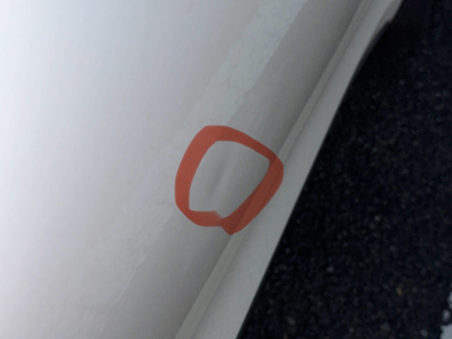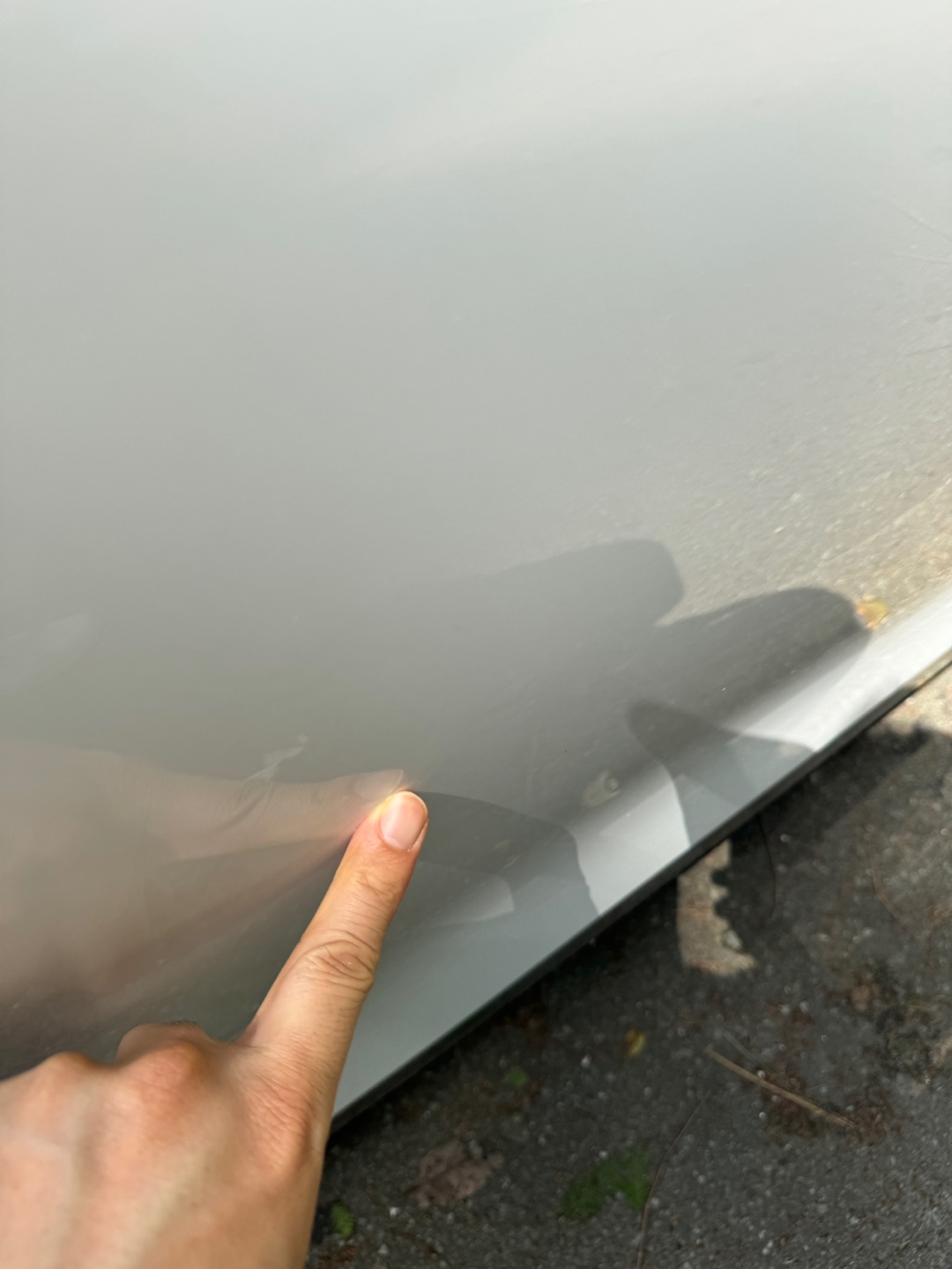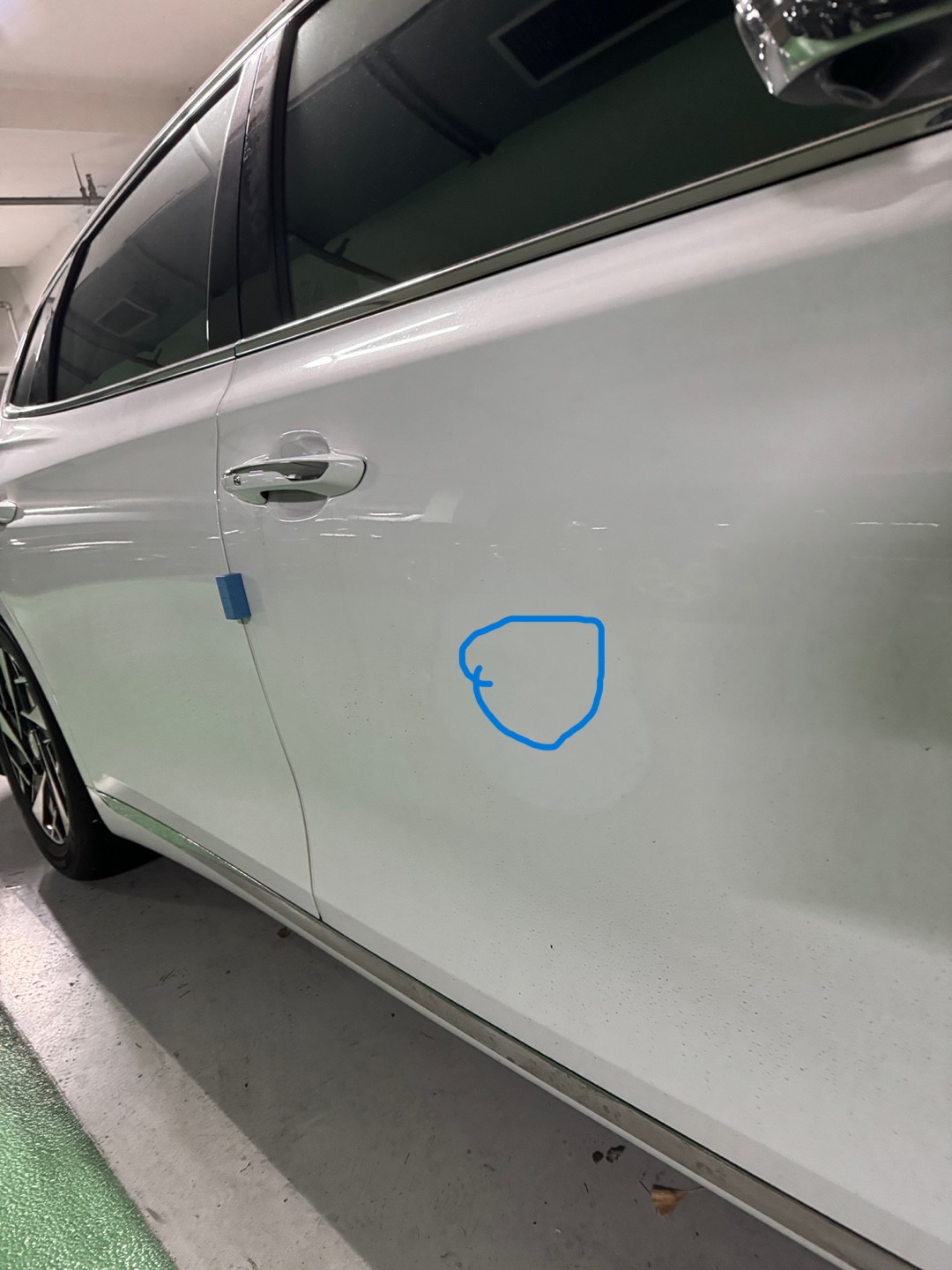 옆에서 보거니 빛을 비춰보면 잘 보입니다. 문콕인지 좀 면적이 넓게 들어갔습니다. 사장님 말씀으로는 문콕이 아니고 킥보다나 자전거? 같은 걸로 손상을 입은 게 아닌가 했습니다.