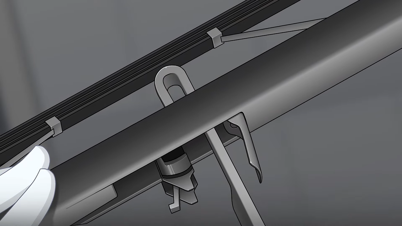 2. 와이퍼를 세운뒤 와이퍼 블레이드에 있는 잠금 커버를 열고, 와이퍼 블레이드와 와이퍼 암이 T자게 되게 만든다.