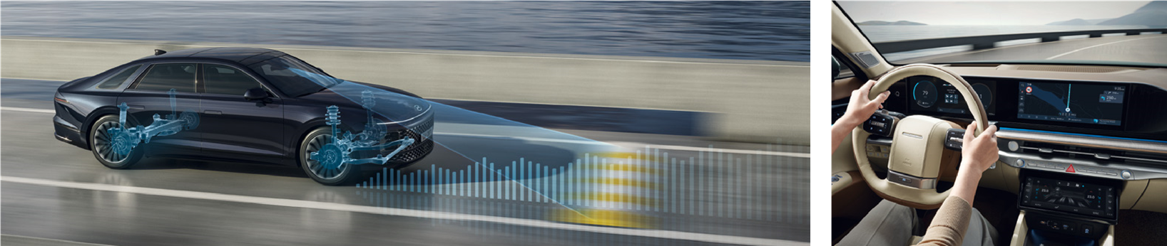 전방 카메라와 내비게이션을 통해 전방의 노면 정보를 미리 인지하여 노면에 적합한 서스펜션 감쇠력 제어로 최적화된 승차감을 제공합니다.