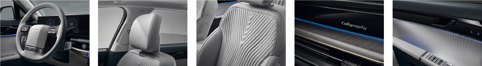 캘리그래피 풀옵션(인디고/라이트 그레이 투톤): 베 젤리스 인사이드미러, 실내 항균 처리 소재, 스웨이드 내장재, 인터랙티브 앰비언트 무드램프, 전동식 틸트 & 텔레스코픽 스티어링 휠(진동경고, 열선, 인터랙티브 라이트 포함), 전자식 변속 칼럼, 현대 차세대 인포테인먼트 시스템(ccNC), 도어트림 와이드 풀 암레스트, 10.25인치 풀터치 공조 컨트롤러(햅틱 기능 포함)
