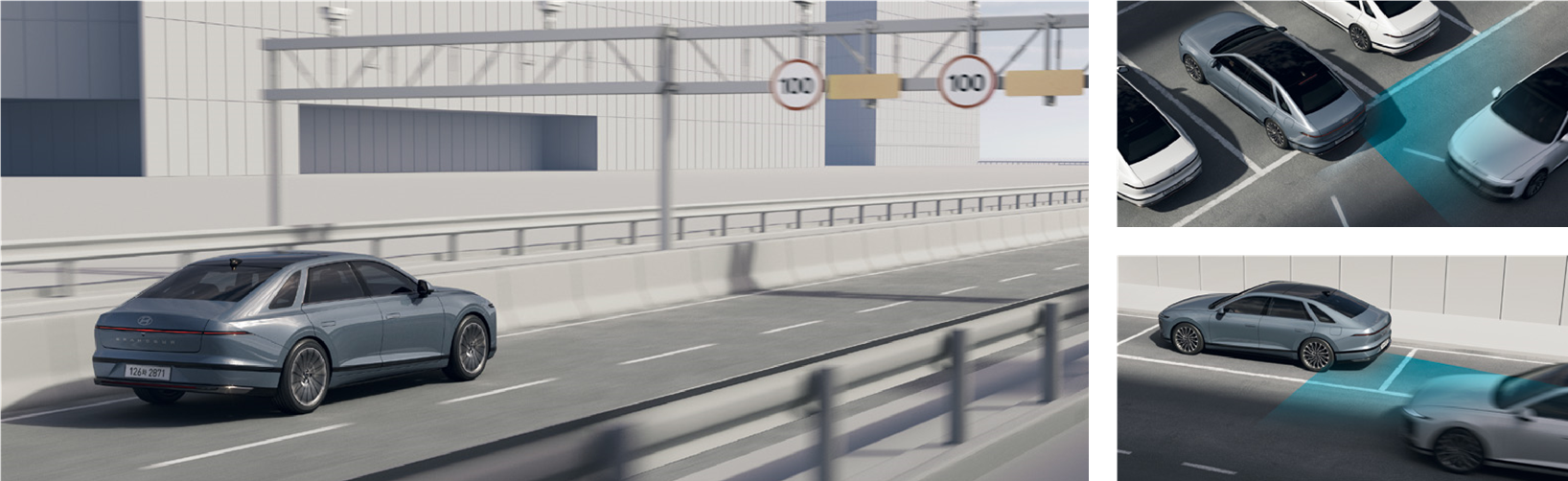 차로 변경을 위하여 방향지시등 스위치를 움직였을 때, 후측방 차량과 충돌 위험이 감지되면 경고를 해줍니다. 평행 주차상태에서 전진 출차 중 후측방 차량과 충돌 위험이 감지되면 자동으로 제동을 도와줍니다. 방향지시등 스위치 조작 시 해당 방향의 후측방 영상이 클러스터에 표시됩니다.
