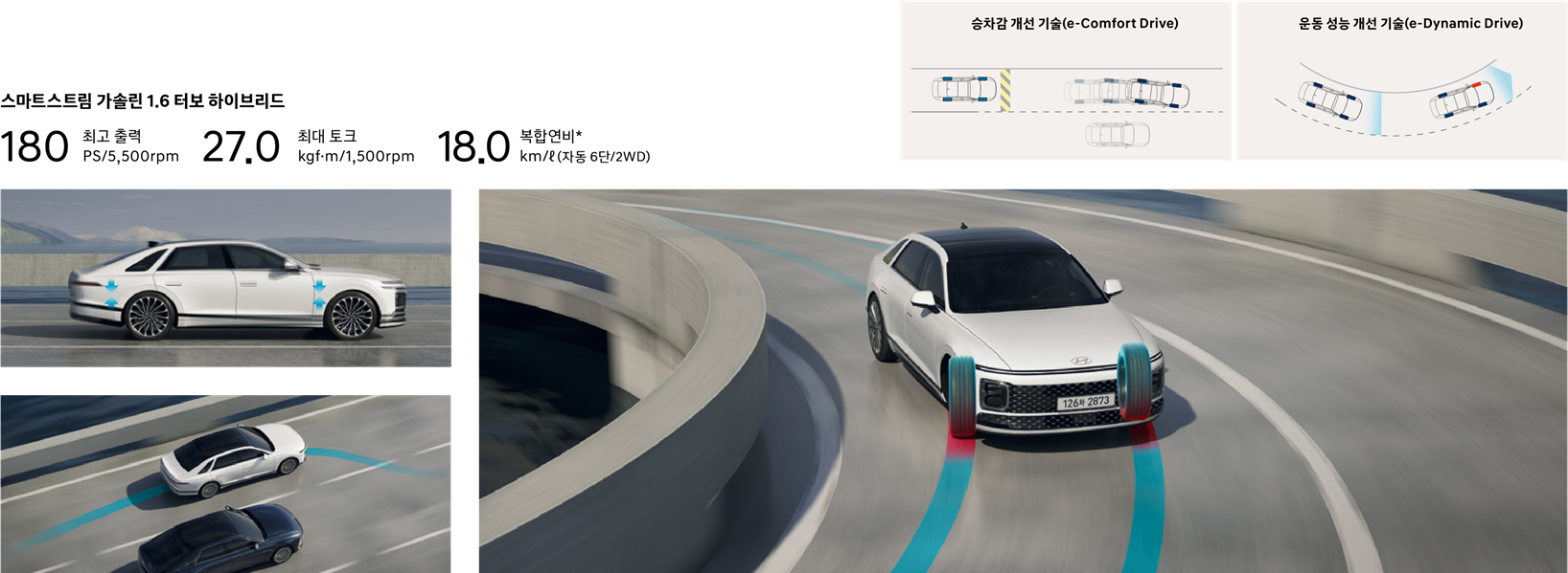 속도 방지턱을 통과하거나 가속 시 모터가 차량의 흔들림을 제어하여 부드러운 승차감을 제공하고, 운전자의 흔들림을 최소화합니다. * 연비는 18인치 타이어 기준입니다.